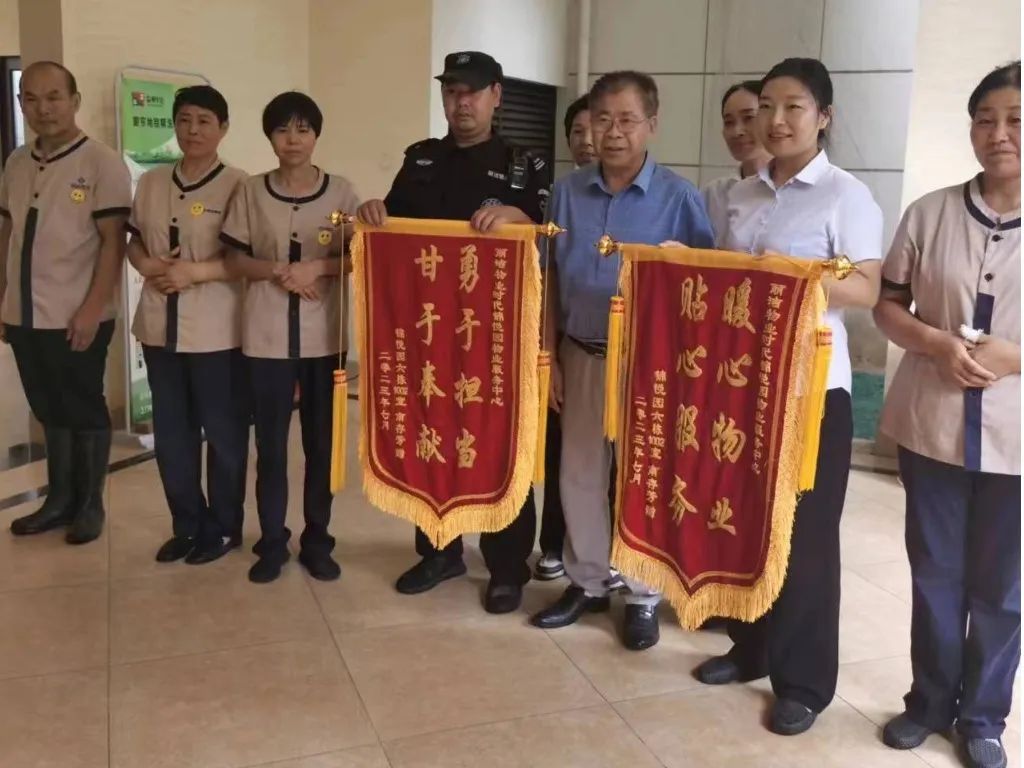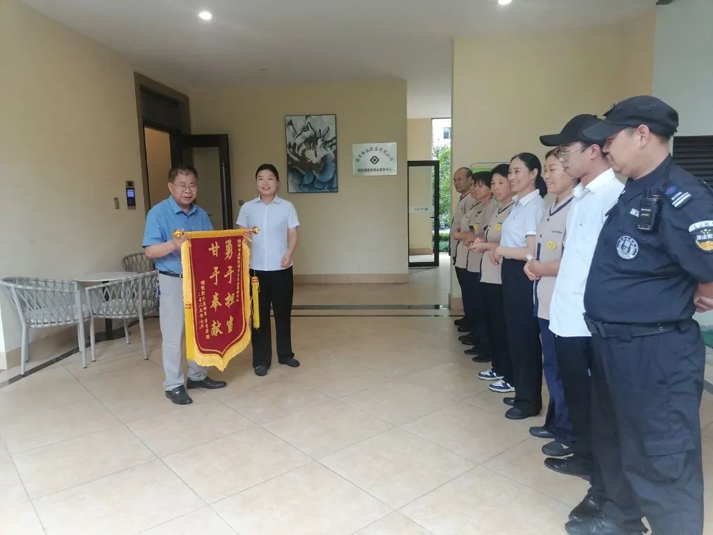 7月27日下午,錦悅園業主南先生冒雨來到小區物業服務中心,在錦悅園工作人員的見證下,將兩面承載著濃厚情誼的錦旗贈予當事人,贊揚了物業經理帶隊有方,并對物業工作給予了高度的肯定。