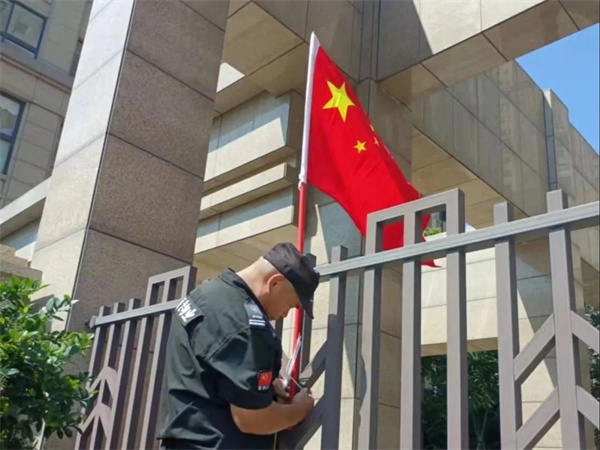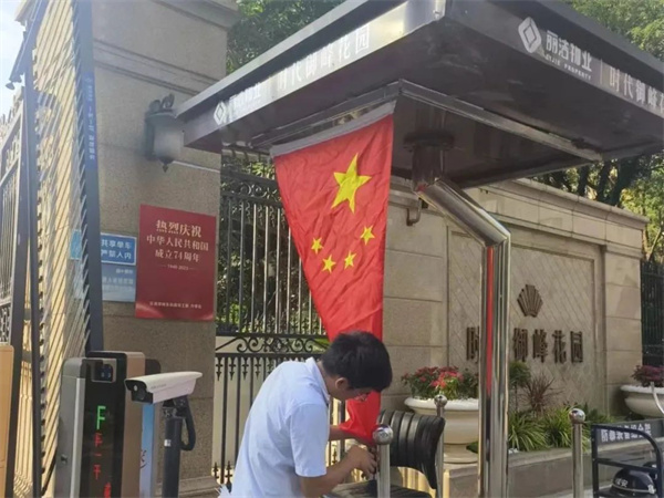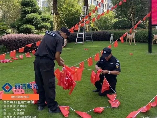 “良辰美景迎中秋 盛世華誕賀國慶”,為讓業主感受到中秋、國慶雙節的濃厚節日氛圍,麗潔服務工作人員提前在多個小區出入口、主干道等區域懸掛中秋國慶條幅及鮮紅的五星紅旗等裝飾,不僅扮靚了小區,也成為了一道靚麗的風景線,讓業主家人們感受到了濃濃的節日氣氛。